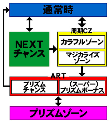 ART、プリズムチャンス・(スーパー)プリズムボーナスへは、主にカラフルゾーンやマジカライズゾーンといったCZを経由して突入する。その他、特定小役成立時の直撃パターンも存在。