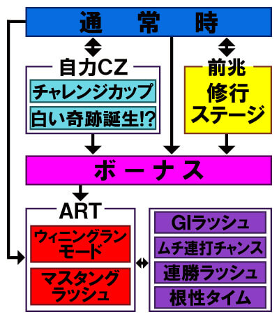 初期ゲーム数はウイニングランモードの結果次第で毎回異なる(2セット目以降は30G固定)。1Gあたり純増約2.0枚のART。MAX継続率85%のループタイプで、セット数上乗せもアリ。さらにゲーム数直乗せも抽選している。