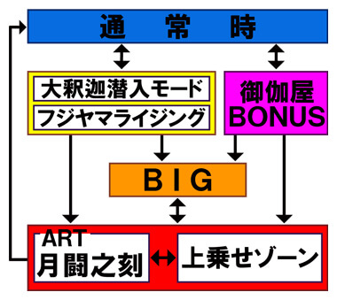通常時からの当選契機は、規定ゲーム数での到達で突入する前兆ゾーン「大釈迦潜入モード」と自力CZ「フジヤマライジング」の2通り存在。前者は仲間が増えるほど期待度がアップし、後者はゾーン中に月闘之刻絵柄もしくは7絵柄を揃えることができればART以上が確定する。