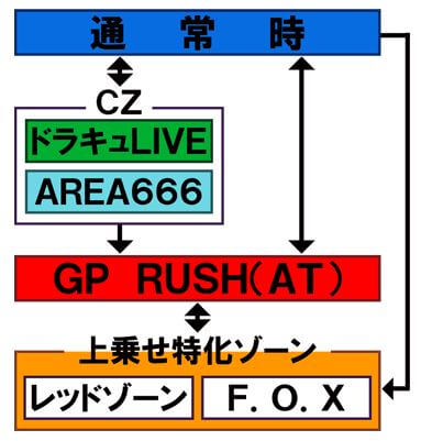 なお突入契機は通常時の特定小役や化け返しの他、10G継続の自力チャンスゾーン「ドラキュLIVE」「AREA666」から突入する。