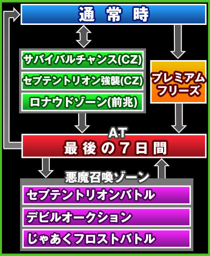 セプテントリオンバトル中は、セプテントリオン撃破で全役上乗せ悪魔の獲得、またはじゃあくフロストバトルに突入するほか、ATのストーリーが進行。7体倒せば衝撃の展開が待っている。