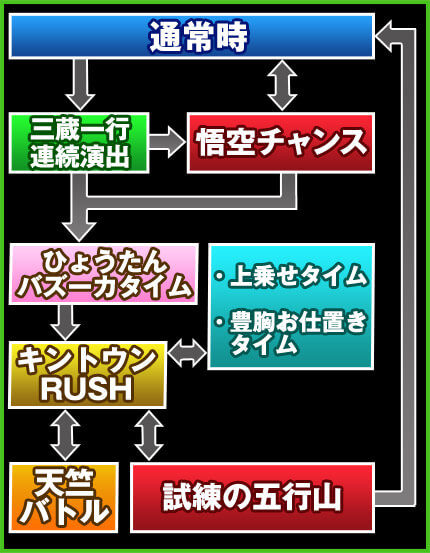 三蔵一行連続演出のハズレ時の一部で移行するチャンスゾーン。押し順ベルの2択当ての成功時の一部でAT当選。または悟空チャンスを20G持ちこたえればAT当選、いずれもひょうたんバズーカタイムに突入する。