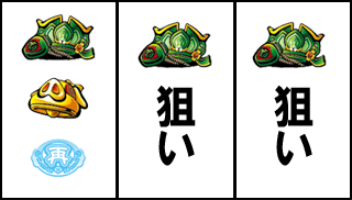 (キントウン図柄を目安に)中、右リールにスイカを狙おう。斜め揃い時は弱スイカ、斜めスイカテンパイハズレなら弱チャンス目。平行揃いなら強スイカ、平行スイカテンパイハズレなら強チャンス目となっている。