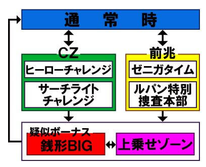 銭形BIGの前兆ゾーンはゼニガタイム・ルパン特別捜査本部の2種類。後者の方が期待できる。