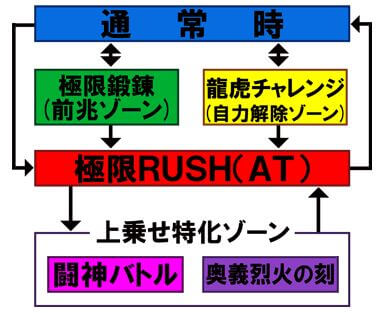AT「極限RUSH」へは、規定ゲーム数消化・自力解除ゾーンにあたる「龍虎チャレンジ」中の抽選・特定小役成立時の直撃当選などを契機に突入する。