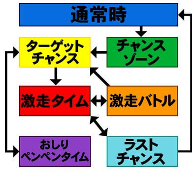 ATの初期ゲーム数を抽選するゾーン。性能的にはATと同じく純増2.9枚となっており、特定小役成立時や図柄コンボでATのゲーム数を上乗せする。また、おしりペンペンタイム(OPT)確定後もターゲットチャンスに突入。この場合、OPT突入契機の7揃いが高確率となっている。