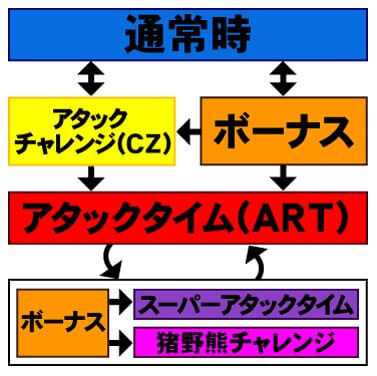 アタックチャレンジは、ART突入を賭けた自力チャンスゾーン。ART突入のメインルートにあたる。消化中は、ハズレ以外の全役でARTの抽選が行われる。