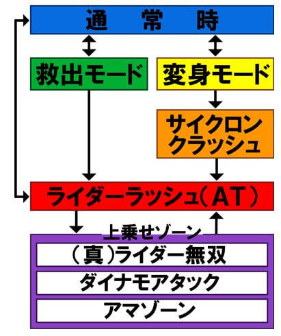 ATは、継続率+ゲーム数上乗せ型となっており、「(真)ライダー無双」「ダイナモアタック」「アマゾーン」といった複数の上乗せ特化ゾーンを搭載。