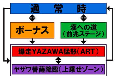 本機は、「遊びやすさ」と「満足感」を備えたボーナス+ARTタイプ。ART「爆走YAZAWA猛努」は、1セット50G+α、1Gあたり純増約1.6枚という性能で、こちらへは通常時の特定小役成立時やボーナス中の抽選などを契機に突入する。