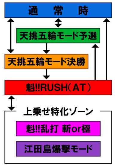 このATへは、主に通常時の特定小役成立時に発生する可能性がある「特訓演出」、「決闘演出」といった連続演出や、前兆の役割を担う「天挑五輪モード 予選」、「天挑五輪モード 決勝」などを契機に突入。加えて、赤7揃いやBAR揃いからの直撃突入パターンも存在する。