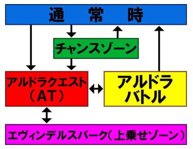 本機は、ボーナス非搭載ながら1Gあたり純増2.5枚のAT「アルドラクエスト」にて出玉を増やしていく。こちらへの突入契機は、自力による特定小役解除もしくはATチャンス演出成功にて突入。また複数の上乗せ特化ゾーンも搭載されており、一撃大量出玉も十分射程圏内となっている。