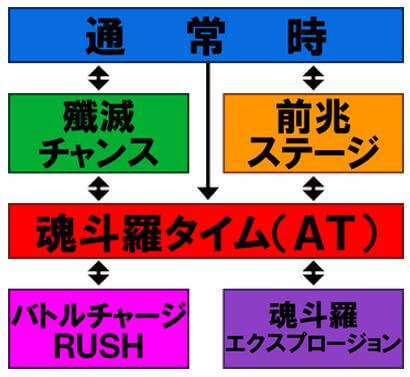 AT消化中は、特定小役成立時に上乗せ特化ゾーンへの抽選が行われる。レア小役なら「バトルチャージRUSH」の抽選を、赤7揃いなら「魂斗羅エクスプロージョン」への突入が確定。