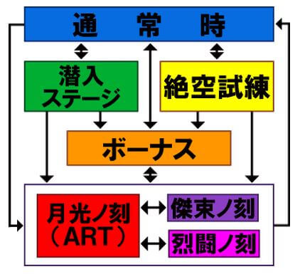 1セット50G+α、1Gあたり純増約1.7枚のART。消化中は特定小役成立時にゲーム数の上乗せ抽選が行われるほか、リプレイ以外の小役5連続で上乗せ特化ゾーン、傑束ノ刻に突入する。