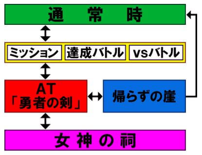 通常時は、主人公ユウを勇者にすることができればAT「勇者の剣」突入となる仕組みで、ATは初期ゲーム数50G以上、1Gあたりの純増約2.5枚となっており、初当り時に「魔城への橋」で初期ゲーム数を決定したのち、「魔王の城」に突入。