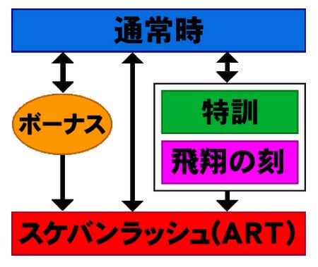 多彩な突入契機を持つART「スケバンラッシュ」は、消化中に成立した特定役によって継続率が変動するタイプ。成立役ごとにHPを獲得し、そのHPがARTの継続率に影響を与えるシステムとなっている。