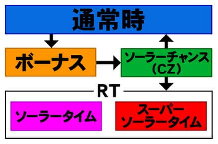 RT「ソーラータイム」へは、ボーナス後のCZ「ソーラーチャンス」中に特殊リプレイが入賞することで突入する。50or150G継続し、1Gあたり約0.4枚のコイン増加が見込める。