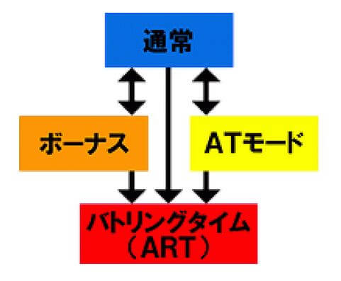 通常時のチェリー・チャンス目・スイカといった特定小役成立時やボーナス関連の抽選に加え、ART超高確ゾーン的な役割を果たす「ATモード」などから突入のチャンスがある。