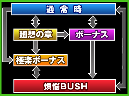 極楽ループシステムを司るのが1セット20G+αの「煩悩BASH」で、この間は純増約3.0枚の疑似ボーナス「極楽ボーナス」を超高確率で抽選する。ボーナス終了後は必ず「煩悩BASH」へ突入し、残り20Gから再スタートでボーナスを狙う事が可能だ。