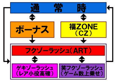 ARTは、1セット40G+α、1Gあたり純増約2.3枚という性能で、上乗せ期待度が異なる3つのモードが存在する。その上位モードにあたるのが「真・フクゾーラッシュ」と「極・フクゾーラッシュ」。後者が最も上乗せに期待でき、この間にレア小役を引けば必ずゲーム数を上乗せする。