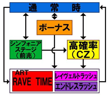 通常時には複数のステージが存在し、液晶上部のレイヴ獲得を目指す。また、神殿ステージへ移行すれば高確にあたる時の亀裂ステージへ直接突入させる大チャンスとなる。
