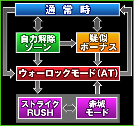 ウォーロックモードは差枚数管理型のATで、主にボーナスを契機に突入。初当り時は上乗せ特化ゾーン「ストライクRUSH」を経由する。