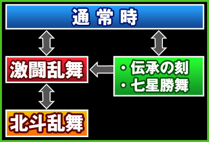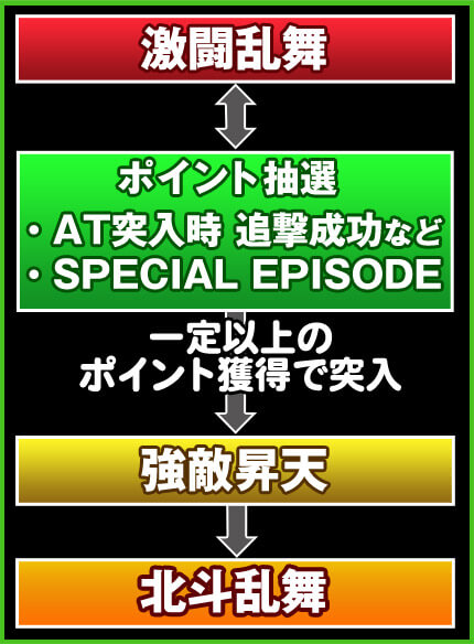 AT当選契機として、これまでの王道のモード移行システムと中段チェリーでの当選に加え、新たに2種類のCZ「伝承の刻」、「七星勝舞」が加わった。伝承の刻は20Gの間に「ひでぶ」を貯めるというゲーム性で、貯めた数がそのままAT当選期待度となるタイプのCZ。七星勝舞は前作・転生の章のバトル「神拳勝舞」を踏襲したCZで、7Gの間にバトルに勝利できればATの突入となる。