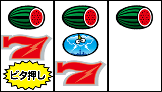 左リールは中段に赤7をビタ押しし、上段にスイカを揃える。