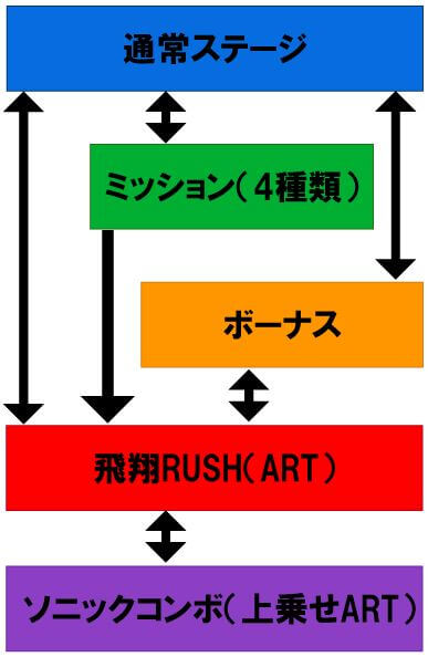 また、飛翔RUSHゲーム数を大量に上乗せ可能な『ソニックコンボ』へは飛翔RUSH終了後に突入のチャンスとなる。