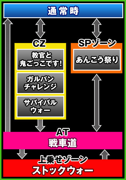 AT「戦車道」は1セットの継続ゲーム数は不定、バトル勝敗が決するまで継続するバトル型ATタイプ。バトル勝利でセット継続となり、セット継続率は実質67〜88%となっている。なおセット継続期待度は対戦校で示唆を行う。
