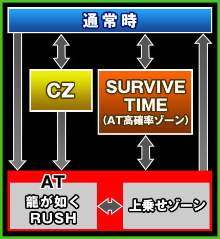 通常時は4種類の内部状態が存在する。状態はCZの当選率に関係し、高確以上ならばチャンス。さらに状態アップ後はCZもしくは龍が如くRUSHに当選するまでダウンしない。
