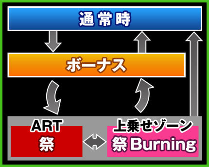 祭BurningはARTのセット数上乗せゾーンとなっており、消化中はリプレイ以外の小役で上乗せ抽選を行う。