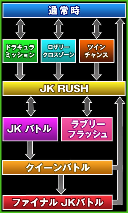また、例外パターンとして、「JKラッシュ中に1度もJKバトルに発展しなかった」場合は必ずAT終了後にDMに移行する。そのため、上記の示唆内容とは異なる展開になる事を覚えておこう。