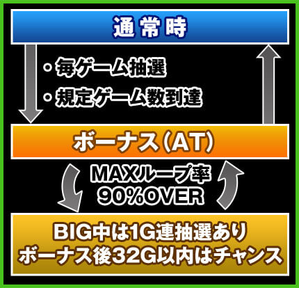本機のボーナスは、前作同様内部的にATとなっており、1Gあたり約3.0枚の増加が見込める。初当りは基本的にREGスタートとなり、BIG当選なら32G以内の連チャンが約束される天国モード確定。