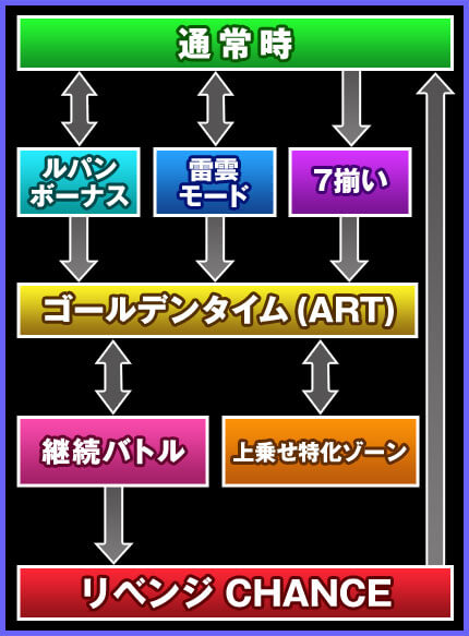 ・レア役直撃、ルパンボーナス、雷雲モードなど各種CZからのART当選を目指す