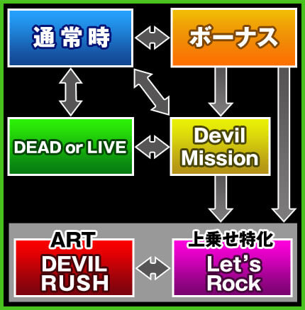 また、REG終了後のミッション移行時は、消化中にストックしたデビルストックの数に応じてARTの抽選を行う。当選率は、基本的にストック数に比例してアップ(10個でART当選確定)するが、ストック0個ので終了した場合はART当選確定。