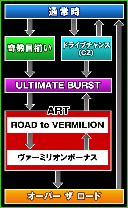 | ART性能 | 純増約1.9枚/G(ボーナス込み)・初期ゲーム数アルティメットバーストで決定 | |