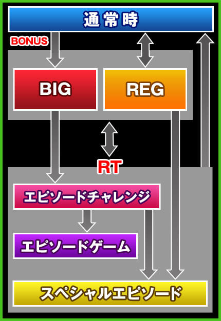 BIG BONUS消化後は25GのRT「エピソードチャレンジ」に移行する。このRT中は1/3.5でエピソードゲームへの移行リプレイが成立(液晶上では泡のブクブク発生)しており、その際に目押しが成功すればエピソードゲームに突入するぞ。
