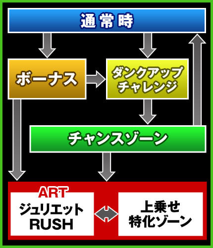 消化中はART突入抽選を行い、7揃いでART突入。非当選時はダンクアップチャレンジへ移行。