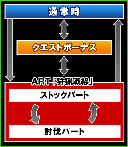 ARTはストックパートと討伐パートを行き来して進行。当選時はまずストックパートに移行して狩珠を獲得。ここで得た狩珠を持って討伐パートへ、という流れになっている。各パートの概要は下記参照。