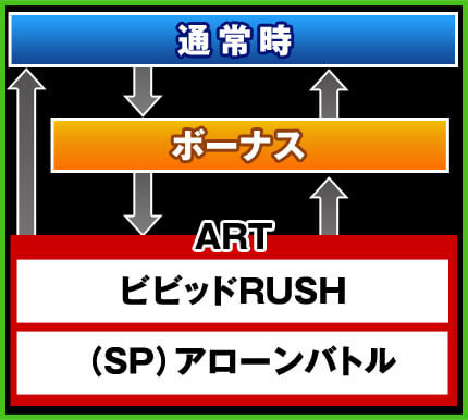 ボーナスは本機のART当選契機となっており、当選時にART抽選を行う(ART中の当選ならストック抽選)。その際の状態によって当選率が大きく異なり、超高確滞在時ならART当選確定。