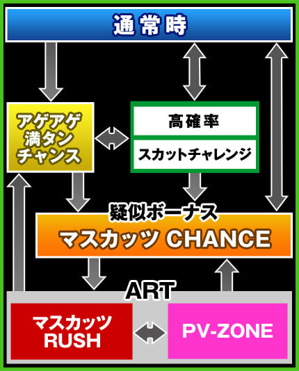 ART「マスカッツRUSH」突入時は、まず初期ゲーム数獲得ゾーンを経由。ここで得たゲーム数を持ってARTがスタートし、消化中は規定アゲアゲポイント到達を目指す。アゲアゲポイントが満タンになると高確率・ゲーム数上乗せ・PV-ZONEのいずれかが発生。また、レア役成立時はPV-ZONEの抽選を行う。
