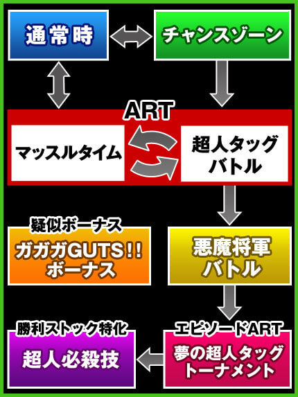 本機のARTはバトル目出現まで継続するタイプ。消化中はバトル勝利ストック抽選が行われ、バトル目出現で超人タッグバトルに発展。バトル勝利でART継続、敗北で終了となる(バトル勝利ストックがあれば継続)。