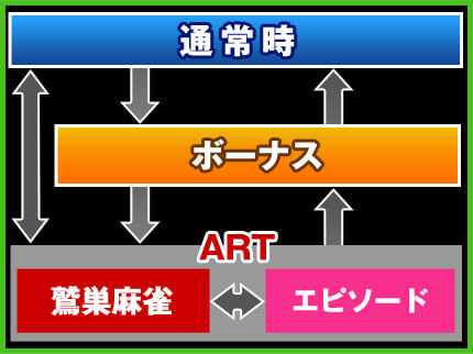 通常時のストーリーは起・承・転・決の4パートで構成されており、各ストーリー(周期)開始時や成立役に応じてART・ボーナス・ストーリー進行の抽選を行う。