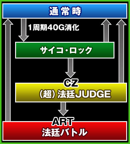 CZへの突入をG数で管理しており、1周期40G消化で1Gの限定演出「サイコ・ロック」へ必ず移行。ここで解除できればCZへ突入する流れとなっている。