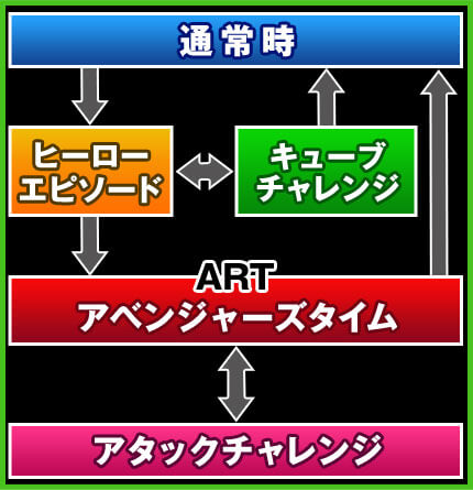 通常時のCZ当選率に関わる状態には、低確・高確に加えて特殊ステージとしてアベンジゾーン(ART終了後400G、800Gで移行)が存在。