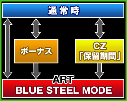 ART「BLUE STEEL MODE」へは、期待度約50%のCZ「対艦演習」やボーナス中の抽選のほか、通常時からの直撃パターンなどを契機に突入する。