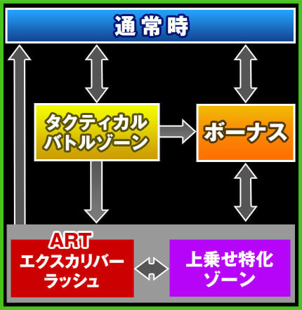 本機はボーナス+ARTタイプとなっており、通常時は1周期40Gを消化すると必ず「討伐型戦闘領域(タクティカルバトルゾーン)」に突入。こちらでは味方キャラがカードスキルを駆使してバトルを展開し、勝利するとART「エクスカリバーラッシュ」に突入する流れだ。
