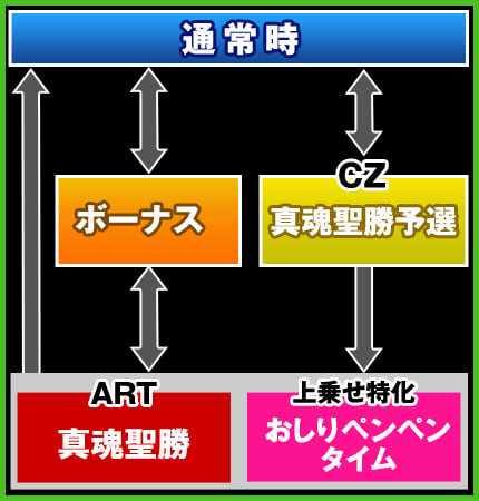 シリーズでARTの代名詞だった「武闘会」が、本機では純増102枚のリアルボーナス「武闘会BONUS」へと変更。ボーナス消化中は当選役に応じたガチバトルとなり、敵の体力ゲージを「0」に出来れば勝利確定。通常時のバトル勝利はART「真魂聖勝」当選、ART中の場合は倒した相手のOPT(おしりペンペンタイム)が確定する。