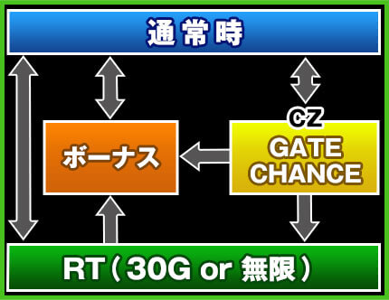 通常時は、チャンスリプレイ成立で突入するCZ「GATE CHANCE」中に、GATE図柄が揃えばボーナスorRT突入が確定。CZ突入率は設定1でも1/69と軽いうえ、CZ中のGATE図柄揃い期待度も約40%と高く、頻繁にチャンスが訪れる点が特徴的だ。
