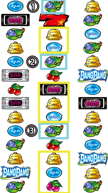 右リールに「バンバン・リプレイ・バンバン」を狙う(赤7を早めに狙うイメージ)。※ビタ押しの必要なし。アバウトでOK